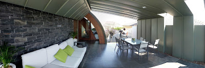 As the site slopes down the hill, there are two ways of entering the house as one leaves the car in a space carved under the structure. One can walk up a few steps that lead to the swimming pool and then go straight into the living room.